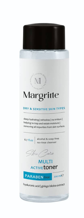 بعد از شستشوی صورت یا استفاده از میسلار واتر و شستشو دهنده ها و پاک کردن مواد آرایشی از روی پوست، مقداری از مواد آرایشی و انواع آلودگی ها در منافذ پوست باقی می ماند. در این حالت نیاز به مصرف تونر صورت برای پاکسازی منافذ پوست دارید. تونر مولتی اکتیو پوست خشک و حساس مارگریت بدلیل داشتن خاصیت آبرسانی بالا ساختار پوست را نرم و مرطوب نگه داشته و از ایجاد خشکی، التهاب و کشیدگی پوست جلوگیری می نماید. علاوه بر این در برطرف کردن خطوط سطحی و چین و چروک های صورت موثر است. تونر پاک کننده مارگریت باعث تسکین التهابات پوستی شده و پوست آسیب دیده را ترمیم میکند. یکی از مزیتهای تونر پاک کننده ی مارگریت عدم وجود الکل، مواد صابونی و پارابن در فرمولاسیون آن بوده که همین ویژگی باعث میشود پوست شما به مرور زمان خشک نشود.
